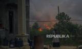 Seorang warga melihat api yang membakar lahan di dekat permukiman di Kecamatan Landasan Ulin, Banjarbaru, Kalimantan Selatan, Jumat (23/6/2023). Kencangnya angin di lokasi kebakaran lahan membuat api dengan cepat menyebar membakar lahan mencapai puluhan hektare dan hingga kini tim gabungan BPBD, Brimob dibantu relawan pemadam kebakaran masih berupaya memadamkan api yang mendekati permukiman penduduk. (FOTO : Antara/Bayu Pratama S )