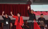Presiden Joko Widodo (kedua kanan) bersama Wakil Presiden Maruf Amin (kanan), Ketua Umum PDI Perjuangan Megawati Soekarnoputri (kedua kiri), Ketua DPP PDI Perjuangan Puan Maharani (kiri) menghadiri puncak peringatan Bulan Bung Karno di Stadion Utama Gelora Bung Karno, Jakarta, Sabtu (24/6/2023). PDI Perjuangan menggelar konsolidasi akbar dalam memperingati puncak Bulan Bung Karno 2023 bertemakan Kepalkan Tangan Persatuan untuk Indonesia Raya yang dihadiri sekitar 100.000 orang relawan, simpatisan hingga kader. (FOTO : Republika/Putra M. Akbar)