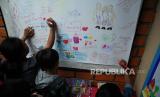 Sejumlah anak menggambar bersama saat pameran gambar bertajuk Menggambar Ceria karya anak-anak sekolah dasar prasejahtera yang digelar Rumah Belajar Sabilulungan, Kota Bandung, di Jalan Suaksari II, Ahad (25/6/2023). Pameran menampilkan sekitar 160 gambar kreasi dari 35 pelajar yang merupakan anak-anak keluarga prasejahtera. Latar belakang diselenggarakan pameran tersebut untuk melatih para siswa berkreativitas dan mengekspresikan diri melalui gambar. (FOTO : Edi Yusuf/Republika)