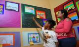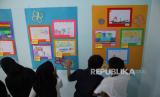 REPUBLIKA.CO.ID, BANDUNG -- Sejumlah anak melihat gambar karyanya yang dipamerkan saat pameran gambar bertajuk 'Menggambar Ceria' karya anak-anak sekolah dasar prasejahtera yang digelar Rumah Belajar Sabilulungan, Kota Bandung, di Jalan Suaksari II, Ahad (25/6/2023).