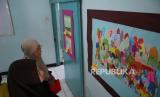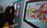 Para pengunjung, di antaranya adalah orang tua para siswa melihat pameran gambar bertajuk Menggambar Ceria karya anak-anak sekolah dasar prasejahtera yang digelar Rumah Belajar Sabilulungan, Kota Bandung, di Jalan Suaksari II, Ahad (25/6/2023). Pameran menampilkan sekitar 160 gambar kreasi dari 35 pelajar yang merupakan anak-anak keluarga prasejahtera. Latar belakang diselenggarakan pameran tersebut untuk melatih para siswa berkreativitas dan mengekspresikan diri melalui gambar. (FOTO : Edi Yusuf/Republika)