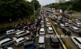 Sejumlah kendaraan terjebak kemacetan di Jalan Benyamin Suaeb, Kemayoran, Jakarta Pusat, Ahad (25/6/2023). Berdasarkan pantauan Republika pada pukul 17.20 WIB, antrean kendaraan terjadi di akses jalan menuju lokasi gelaran Jakarta Fair 2023 di JIExpo Kemayoran Jakarta yang disebabkan oleh adanya peningkatan jumlah pengunjung Jakarta Fair pada akhir pekan. (FOTO : Republika/Thoudy Badai)