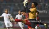 Pesepak bola Persija Jakarta Rizky Ridho (kiri) berebut bola dengan kiper Ratchaburi FC Tossaporn Srisueng (kanan) saat pertandingan persahabatan di Stadion Patriot Candrabhaga, Bekasi, Jawa Barat, Ahad (25/6/2023). Persija Jakarta menang atass Ratchaburi FC dengan skor 1-0. (FOTO : Antara/Galih Pradipta )