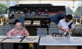 REPUBLIKA.CO.ID,JAKARTA -- Warga mengurus berkas saat melakukan pembayaran pajak kendaraan bermotor di Pelayanan Samsat Keliling, Polda Metro Jaya, Jakarta, Senin (26/6/2023).