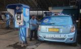 Sopir mengisi daya mobil listrik di Kantor Operasional Blue Bird, Jakarta, Senin (26/6/2023). PT Blue Bird Tbk menargetkan penambahan hingga 500 unit armada listrik dari total gabungan BYD E6, BYD T3 dan Ioniq 5. Implementasi ini sejalan dengan komitmen Visi Keberlanjutan Bluebird pada pilar BlueSky dengan agenda pengurangan emisi hingga 50 persen pada tahun 2030. (FOTO : Republika/Putra M. Akbar)