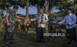 Komandan Korem 061 Suryakencana Brigjen TNI Anan Nurakhman (kiri) meninjau sapi kurban yang diserahkan ke warga di wilayah dampak gempa Desa Mangunkerta, Cianjur, Jawa Barat, Kamis (29/6/2023). Sedikitnya empat ekor sapi dan 50 ekor kambing disalurkan dan didistribusikan Korem 061 Suryakencana sebagai bantuan kurban pada Idul Adha 1444 hijriah bagi masyarakat dari tiga desa yakni Desa Mangunkerta, Desa Gasol, dan Desa Sarampad yang termasuk dalam wilayah episentrum gempa Cianjur beberapa waktu lalu. (FOTO : ANTARA FOTO/Novrian Arbi)