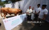 REPUBLIKA.CO.ID, JAKARTA -- Direktur Utama BSI Hery Gunardi didampingi Wakil Komisaris Utama BSI Adiwarman A Karim dan Wakil Direktur Utama BSI Bob Tyasika Tyasika Ananta menyerahkan secara simbolis bantuan hewan kurban kepada dhuafa di Jakarta, Kamis (29/6/2023).