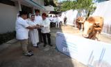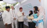 Direktur Utama BSI Hery Gunardi (tengah) didampingi Wakil Komisaris Utama BSI Adiwarman A Karim (kiri) dan Wakil Direktur Utama BSI Bob Tyasika Tyasika Ananta (tiga dari kiri) menyerahkan secara simbolis bantuan hewan kurban kepada dhuafa di Jakarta, Kamis (29/6/2023). BSI memberikan 7.112 hewan kurban di berbagai wilayah seluruh Indonesia. Jumlah ini naik dua kali lipat dibanding tahun sebelumnya sebanyak 3.691 hewan kurban. (FOTO : Dok Republika)