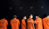 Para tersangka dihadirkan saat rilis pengungkapan kasus peredaran gelap narkoba di Lobby Bareskrim Polri, Jakarta, Jumat (30/6/2023). Direktorat Tindak Pidana Narkoba Bareskrim Polri berhasil mengungkap kasus peredaran gelap narkoba dengan total barang bukti 428 Kg sabu dan 162.932 butir ekstasi dari 3 lokasi berbeda yaitu Aceh, Riau dan Bali dengan mengamankan total 13 tersangka.  (FOTO : Republika/Prayogi)