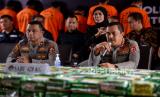 Kabareskrim Polri Komjen Pol Agus Andrianto (kanan) bersama Dirtipidnarkoba Bareskrim Brigjen Pol Mukti Juharsa (kiri) memberikan keterangan saat rilis pengungkapan kasus peredaran gelap narkoba di Lobby Bareskrim Polri, Jakarta, Jumat (30/6/2023). Direktorat Tindak Pidana Narkoba Bareskrim Polri berhasil mengungkap kasus peredaran gelap narkoba dengan total barang bukti 428 Kg sabu dan 162.932 butir ekstasi dari 3 lokasi berbeda yaitu Aceh, Riau dan Bali dengan mengamankan total 13 tersangka.   (FOTO : Republika/Prayogi)