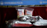 REPUBLIKA.CO.ID, JAKARTA -- Sejumlah barang bukti diperlihatkan saat rilis pengungkapan kasus peredaran gelap narkoba di Lobi Bareskrim Polri, Jakarta, Jumat (30/6/2023).