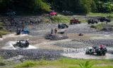 REPUBLIKA.CO.ID, SLEMAN -- Wisatawan mengikuti trip wisata Lava Tour Merapi di kawasan Kali Kuning, Sleman, Yogyakarta, Jumat (30/6/2023).