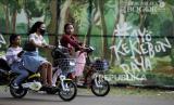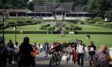 Sejumlah pengunjung bersepeda saat wisata di Kebun Raya Bogor, Kota Bogor, Jawa Barat, Jumat (30/6/2023). Pada libur Hari Raya Idul Adha 1444 Hijriah, jumlah pengunjung yang berwisata ke Kebun Raya Bogor meningkat 10 persen atau sebanyak 5.000 wisatawan terhitung sejak Rabu (28/6/2023). (FOTO : Republika/Putra M. Akbar)