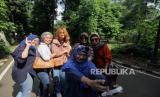Sejumlah pengunjung berswafoto saat wisata di Kebun Raya Bogor, Kota Bogor, Jawa Barat, Jumat (30/6/2023). Pada libur Hari Raya Idul Adha 1444 Hijriah, jumlah pengunjung yang berwisata ke Kebun Raya Bogor meningkat 10 persen atau sebanyak 5.000 wisatawan terhitung sejak Rabu (28/6/2023). (FOTO : Republika/Putra M. Akbar)