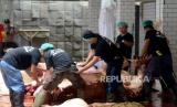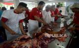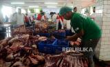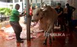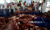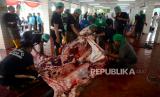 Panitia memotong daging hewan kurban yang telah disembelih di Rumah Potong Hewan (RPH) Masjid Istiqlal, Jakarta, Sabtu (1/7/2023). Pada tahun 2023 ini masjid Istiqlal menyembelih 43 ekor sapi dan 8 ekor kambing jumlah itu meningkat hampir 50 persen di banding tahun 2022 lalu. Sedangkan untuk pendistribusian daging kurban tidak dilakukan secara langsung, namun dilakukan melalui perwailan Masjid, Mushola, Yayasan atau Lembaga yang telah mengajukan permohonan berupa proposal. (FOTO : Republika/Prayogi)