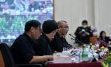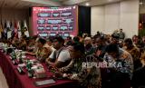 Peserta dari berbagai lembaga mendengarkan pemaparan Ketua KPU Hasyim Asyari saat rapat pleno terbuka rekapitulasi daftar pemilih tetap (DPT) tingkat nasional di ruang sidang lantai 2 Gedung KPU, Jakarta, Ahad (2/7/2023). KPU menetapkan daftar pemilih tetap (DPT) untuk pemilu tahun 2024 terdapat sebanyak 823.220 tempat pemungutan suara (TPS) dengan pemilih 204.807.222 orang yang tersebar di 38 provinsi di seluruh Indonesia. Dari hasil rekapitulasi DPT ini, mayoritas pemilih merupakan generasi milenial yakni 33,60 persen, generasi X 28,07 persen dan generasi Z berada diurutan ketiga atau sebanyak 22,85 persen. (FOTO : Republika/Thoudy Badai)