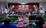 Suasana rapat pleno terbuka rekapitulasi daftar pemilih tetap (DPT) tingkat nasional di ruang sidang lantai 2 Gedung KPU, Jakarta, Ahad (2/7/2023). KPU menetapkan daftar pemilih tetap (DPT) untuk pemilu tahun 2024 terdapat sebanyak 823.220 tempat pemungutan suara (TPS) dengan pemilih 204.807.222 orang yang tersebar di 38 provinsi di seluruh Indonesia. Dari hasil rekapitulasi DPT ini, mayoritas pemilih merupakan generasi milenial yakni 33,60 persen, generasi X 28,07 persen dan generasi Z berada diurutan ketiga atau sebanyak 22,85 persen. (FOTO : Republika/Thoudy Badai)