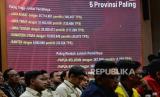 Layar yang menampilkan data jumlah pemilih tiap provinsi saat rapat pleno terbuka rekapitulasi daftar pemilih tetap (DPT) tingkat nasional di ruang sidang lantai 2 Gedung KPU, Jakarta, Ahad (2/7/2023). KPU menetapkan daftar pemilih tetap (DPT) untuk pemilu tahun 2024 terdapat sebanyak 823.220 tempat pemungutan suara (TPS) dengan pemilih 204.807.222 orang yang tersebar di 38 provinsi di seluruh Indonesia. Dari hasil rekapitulasi DPT ini, mayoritas pemilih merupakan generasi milenial yakni 33,60 persen, generasi X 28,07 persen dan generasi Z berada diurutan ketiga atau sebanyak 22,85 persen. (FOTO : Republika/Thoudy Badai)