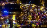 Foto udara antrean kendaraan roda empat di kantong parkir Pelabuhan Ketapang, Banyuwangi, Jawa Timur, Senin (3/7/2023). Antrean terjadi karena adanya peningkatan jumlah kendaraan menuju Pulau Bali pada musim liburan serta terjadinya gelombang tinggi di Selat Bali yang mengakibatkan aktivitas bongkar muat kendaraan terganggu dan menyebabkan antrean hingga 6 jam. (FOTO : ANTARA FOTO/Budi Candra Setya)