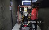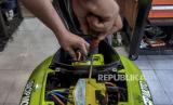 Teknisi memeriksa baterai sepeda motor bbm yang dikonversi menjadi sepeda motor listrik di bengkel Bacip Moto Shop, Jalan Kebon Jati, Kota Bandung, Jawa Barat, Senin (3/7/2023). Bengkel Bacip Moto Shop binaan Bintang Racing Team tersebut merupakan salah satu bengkel resmi pemasangan, perawatan, pemeriksaan peralatan instalasi sistem penggerak motor listrik pada kendaraan bermotor dan mendapatkan lisensi Kementerian Perhubungan. Konversi motor tersebut dipatok dengan harga Rp9,5 juta dengan jarak tempuh rata-rata 40 kilometer. (FOTO : ABDAN SYAKURA/REPUBLIKA)