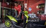 REPUBLIKA.CO.ID, BANDUNG -- Teknisi memeriksa komponen sepeda motor bbm yang dikonversi menjadi sepeda motor listrik di Bengkel Bacip Moto Shop, Jalan Kebon Jati, Kota Bandung, Jawa Barat, Senin (3/7/2023).