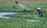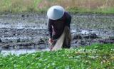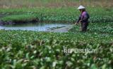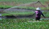 Pencari ikan mencoba menggiring ikan saat menjala ikan lahan rawa yang telah surut dan dipenuhi eceng gondok, di Tegalluar, Kabupaten Bandung, Senin (3/7/2023). Saat musim kemarau, gulma di lahan rawa tumbuh lebih cepat karena genangan air turun dan suhu menghangat. Kondisi tersebut banyak dimanfaatkan warga untuk mencari ikan, karena lebih mudah ditangkap. (FOTO : Edi Yusuf/Republika)