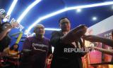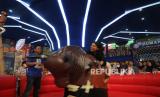 Pengunjung bermain wahana Rodeo saat mengunjungi stan OT Group di PRJ Jakarta, Senin (3/7/2023). Museum Rekor Indonesia kembali mencatat rekor inovasi di industri makanan ringan Indonesia, yaitu Wafer Stick terpanjang di dunia di PRJ. Rekor ini diraih oleh FULLO, produk jenis Wafer Stick yang diproduksi oleh OT Group. (FOTO : Republika/ Tahta Aidilla)