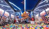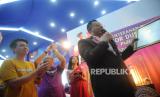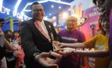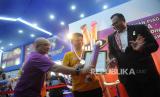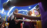 Pengunjung bermain wahana Capit saat mengunjungi stan OT Group di PRJ Jakarta, Senin (3/7/2023). Museum Rekor Indonesia kembali mencatat rekor inovasi di industri makanan ringan Indonesia, yaitu Wafer Stick terpanjang di dunia di PRJ. Rekor ini diraih oleh FULLO, produk jenis Wafer Stick yang diproduksi oleh OT Group. (FOTO : Republika/ Tahta Aidilla)