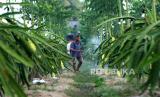 Petani merawat tanaman buah naga kuning di Curahjati Purwoharjo, Banyuwangi, Jawa Timur, Senin (3/7/2023). Budi daya buah naga kuning mulai dikembangkan petani daerah tersebut karena memiliki nilai jual tinggi dan stabil di harga sekitar Rp80 ribu per kilogram jika dibandingkan dengan buah naga merah yang sudah banyak dibudidayakan dan harganya tidak stabil berkisar Rp3 ribu hingga Rp25 ribu per kilogram. (FOTO : Antara/Budi Candra Setya )