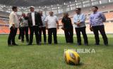 Menteri Pemuda dan Olahraga Dito Ariotedjo (ketiga kiri) saat meninjau Jakarta International Stadium (JIS), Tanjung Priok, Jakarta Utara, Selasa (4/7/2023). Pemerintah akan merenovasi JIS sesuai dengan standar FIFA agar bisa menjadi salah satu venue penyelenggaraan Piala Dunia U-17 2023. Renovasi yang meliputi akses masuk bus bagi pemain dan pejabat, rumput stadion dan berbagai aspek teknis lainnya tersebut ditargetkan rampung dalam tiga bulan. (FOTO : Republika/Putra M. Akbar)