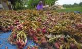 Menurut petani hasil panen bawang merah tahun ini cukup stabil karena curah hujan masih terjadi hingga awal Juli 2023.