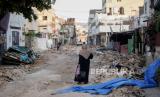Seorang wanita Palestina berjalan di jalan yang rusak di kamp pengungsi Jenin di Tepi Barat, Rabu, (5/7/2023). (FOTO : AP/Majdi Mohammed)