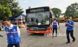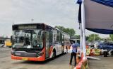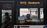 Bus Transjakarta rute Kalideres - Soekarno Hatta tiba di Terminal Kalideres, Jakarta Barat, Jumat (7/7/2023). Bus Transjakarta rute Terminal Kalideres menuju Bandara Soekarno Hatta mulai diberlakukan uji coba untuk penumpang umum selama dua pekan mulai hari Rabu 5 Juli hingga 19 Juli mendatang dengan tarif Rp 0 atau gratis. Sebanyak 10 bus disiapkan untuk melayani masyarakat yang hendak melakukan perjalanan menuju Bandara Soekarno Hatta dengan jam keberangkatan dari pukul 06.00 - 09.00 WIB dan pukul 18.00 - 21.00 WIB. Berdasarkan hasil uji coba yang dilakukan PJ Gubernur bersama Dinas Perhubungan DKI Jakarta, waktu tempuh dari Terminal Kalideres menuju Bandara Soekarno Hatta diperkirakan sekitar 45 menit. Keberadaan rute tersebut diharapkan mampu memberikan kemudahan dan kenyamanan bagi warga yang hendak melakukan perjalanan menuju Bandara Soekarno Hatta. (FOTO : Republika/Thoudy Badai)