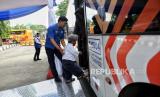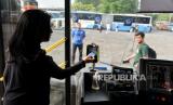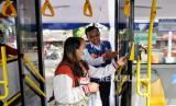 Petugas memberikan imbauan terkait survei kepuasan pelanggan saat menaiki bus Transjakarta rute Kalideres - Soekarno Hatta di Terminal Kalideres, Jakarta Barat, Jumat (7/7/2023). Bus Transjakarta rute Terminal Kalideres menuju Bandara Soekarno Hatta mulai diberlakukan uji coba untuk penumpang umum selama dua pekan mulai hari Rabu 5 Juli hingga 19 Juli mendatang dengan tarif Rp 0 atau gratis. Sebanyak 10 bus disiapkan untuk melayani masyarakat yang hendak melakukan perjalanan menuju Bandara Soekarno Hatta dengan jam keberangkatan dari pukul 06.00 - 09.00 WIB dan pukul 18.00 - 21.00 WIB. Berdasarkan hasil uji coba yang dilakukan PJ Gubernur bersama Dinas Perhubungan DKI Jakarta, waktu tempuh dari Terminal Kalideres menuju Bandara Soekarno Hatta diperkirakan sekitar 45 menit. Keberadaan rute tersebut diharapkan mampu memberikan kemudahan dan kenyamanan bagi warga yang hendak melakukan perjalanan menuju Bandara Soekarno Hatta. (FOTO : Republika/Thoudy Badai)