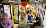 Penumpang menaiki bus Transjakarta rute Kalideres - Soekarno Hatta di Terminal Kalideres, Jakarta Barat, Jumat (7/7/2023). Bus Transjakarta rute Terminal Kalideres menuju Bandara Soekarno Hatta mulai diberlakukan uji coba untuk penumpang umum selama dua pekan mulai hari Rabu 5 Juli hingga 19 Juli mendatang dengan tarif Rp 0 atau gratis. Sebanyak 10 bus disiapkan untuk melayani masyarakat yang hendak melakukan perjalanan menuju Bandara Soekarno Hatta dengan jam keberangkatan dari pukul 06.00 - 09.00 WIB dan pukul 18.00 - 21.00 WIB. Berdasarkan hasil uji coba yang dilakukan PJ Gubernur bersama Dinas Perhubungan DKI Jakarta, waktu tempuh dari Terminal Kalideres menuju Bandara Soekarno Hatta diperkirakan sekitar 45 menit. Keberadaan rute tersebut diharapkan mampu memberikan kemudahan dan kenyamanan bagi warga yang hendak melakukan perjalanan menuju Bandara Soekarno Hatta. (FOTO : Republika/Thoudy Badai)