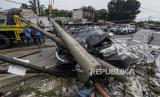 REPUBLIKA.CO.ID, KEMANG -- Pekerja PLN melakukan evakuasi tiang listrik yang menimpa mobil saat terjadi kecelakaan di Jalan Raya Parung, Kemang, Kabupaten Bogor, Jawa Barat, Jumat (7/7/2023).