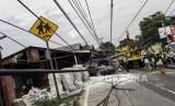 Pekerja PLN melakukan evakuasi tiang listrik yang menimpa mobil saat terjadi kecelakaan di Jalan Raya Parung, Kemang, Kabupaten Bogor, Jawa Barat, Jumat (7/7/2023). Kecelakaan yang melibatkan mobil dan truk yang menghantam tiang listrik itu tidak menimbulkan korban jiwa namun menyebabkan kemacetan lalu lintas di kawasan tersebut. (FOTO : ANTARA FOTO/Yulius Satria Wijaya)
