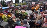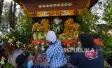 Warga mengambil buah - buahan pada monil peserta saat Festival Bunga dan Buah di Berastagi, Karo, Sumatera Utara, Jumat (7/7/2023). Festival tahunan yang diadakan Pemkab Karo tersebut bertujuan sebagai ungkapan rasa syukur masyarakat setempat atas hasil pertanian sekaligus penunjang pariwisata. (FOTO : Antara/FransiscoCarollio)