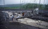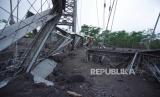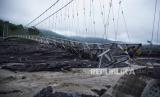 REPUBLIKA.CO.ID, LUMAJANG -- Warga melintas di Jembatan Gantung Kaliregoyo di Dusun Sumberwuluh, Candipuro, Lumajang, Jawa Timur, Sabtu (8/7/2023). Jembatan yang memiliki panjang 198 meter dan menjadi penghubung Desa Jugosari dengan Desa Sumberwuluh tersebut putus akibat diterang banjir lahar hujan pada Jumat (7/7).