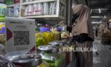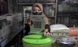 REPUBLIKA.CO.ID,BANDUNG -- Pedagang menunjukkan kode batang QRIS (Quick Response Code Indonesian Standard) di salah satu kios di Pasar Kosambi, Kota Bandung, Jawa Barat, Senin (10/7/2023).