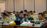 Menteri Dalam Negeri (Mendagri) Muhammad Tito Karnavian (kiri) bersama Panglima TNI Laksamana TNI Yudo Margono (kanan) mengikuti rapat konsultasi dengan Wakil Ketua DPR dan Pimpinan Komisi DPR di Ruang Pansus, Kompleks Parlemen, Senayan, Jakarta, Senin (10/7/2023). Rapat tersebut membahas evaluasi dan pelaksanaan pengelolahan batas wilayah negara dan kawasan perbatasan tahun 2023 - 2024. (FOTO : Republika/Prayogi)