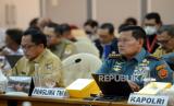 Menteri Dalam Negeri (Mendagri) Muhammad Tito Karnavian (kiri) bersama Panglima TNI Laksamana TNI Yudo Margono (tengah) dan Kapolri Jenderal Pol Listyo Sigit Prabowo (kanan) mengikuti rapat konsultasi dengan Wakil Ketua DPR dan Pimpinan Komisi DPR di Ruang Pansus, Kompleks Parlemen, Senayan, Jakarta, Senin (10/7/2023). Rapat tersebut membahas evaluasi dan pelaksanaan pengelolahan batas wilayah negara dan kawasan perbatasan tahun 2023 - 2024. (FOTO : Republika/Prayogi)