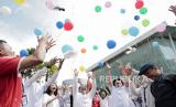 Direktur PT PMLI Dessy Emastari P (ketiga kiri) bersama dewan direksi melepas balon dan merpati saat memperingati hari ulang tahun yang ke-10 PT Pendidikan Maritim dan Logistik Indonesia (PT PMLI), Bogor, Senin (10/7/2023). (FOTO : Dok.Republika)