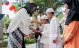 Direktur PT PMLI Dessy Emastari P berikan santunan kepada anak yatim saat memperingati hari ulang tahun yang ke-10 PT Pendidikan Maritim dan Logistik Indonesia (PT PMLI), Bogor, Senin (10/7/2023). (FOTO : Dok.Republika)