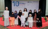 Direktur PT PMLI Dessy Emastari P berbicara berfoto bersama dengan anak yatim saat memperingati hari ulang tahun yang ke-10 PT Pendidikan Maritim dan Logistik Indonesia (PT PMLI), Bogor, Senin (10/7/2023). (FOTO : Dok.Republika)