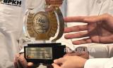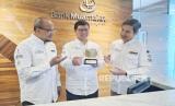 REPUBLIKA.CO.ID,JAKARTA -- Direktur Utama PT Bank Muamalat Indonesia Tbk Indra Falatehan (tengah), SEVP Human Capital Bank Muamalat Riksa Prakoso (kiri) dan Sekretaris Perusahaan Bank Muamalat Hayunaji (kanan) memperlihatkan plakat Strategy-into-Performance Execution Excellence (SPEx2) DX Award di Muamalat Tower, Jakarta, Rabu (12/7/2023).