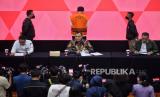 Tersangka sekretaris Mahkamah Agung (MA) Hasbi Hasan mengenakan pakaian tahanan saat dihadirkan dalam konferensi pers pengumuman penahanan tersangka di Gedung Merah Putih KPK, Jakarta, Rabu (12/7/2023). KPK resmi melakukan penahanan terhadap tersangka Hasbi Hasan terkait kasus dugaan suap pengurusan perkara di lingkungan MA. (FOTO : Republika/Thoudy Badai)
