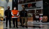 Tersangka sekretaris Mahkamah Agung (MA) Hasbi Hasan mengenakan pakaian tahanan usai dihadirkan dalam konferensi pers pengumuman penahanan tersangka di Gedung Merah Putih KPK, Jakarta, Rabu (12/7/2023). KPK resmi melakukan penahanan terhadap tersangka Hasbi Hasan terkait kasus dugaan suap pengurusan perkara di lingkungan MA. (FOTO : Republika/Thoudy Badai)