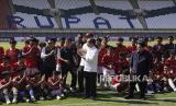 Presiden Joko Widodo (tengah) bersama Menpora Dito Ariotedjo (tengah belakang), Ketum PSSI Erick Thohir (kanan) dan Gubernur Jawa Barat Ridwan Kamil (ketiga kiri) memberi salam usai berfoto dengan calon pemain Timnas sepak bola U-17 saat mengunjungi Stadion Si Jalak Harupat di Kabupaten Bandung, Jawa Barat, Rabu (12/7/2023). Dalam kunjungannya Presiden meninjau renovasi stadion dan melihat langsung seleksi Timnas U-17. (FOTO : ANTARA FOTO/Dhemas Reviyanto)
