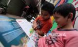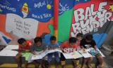 Anak-anak membaca buku di Kampung Literasi, Klender, Jakarta Timur, Kamis (13/7/2023). Kampung Literasi Klender RT 015 RW 04 tersebut menghadirkan balai yang menyediakan buku-buku yang dapat dibaca oleh warga sekitar untuk meningkatkan literasi. Selain itu Kampung Literasi tersebur juga melakukan budi daya sayuran dan ikan yang dapat dikonsumsi oleh warga sekitar secara gratis. (FOTO : Republika/Putra M. Akbar)